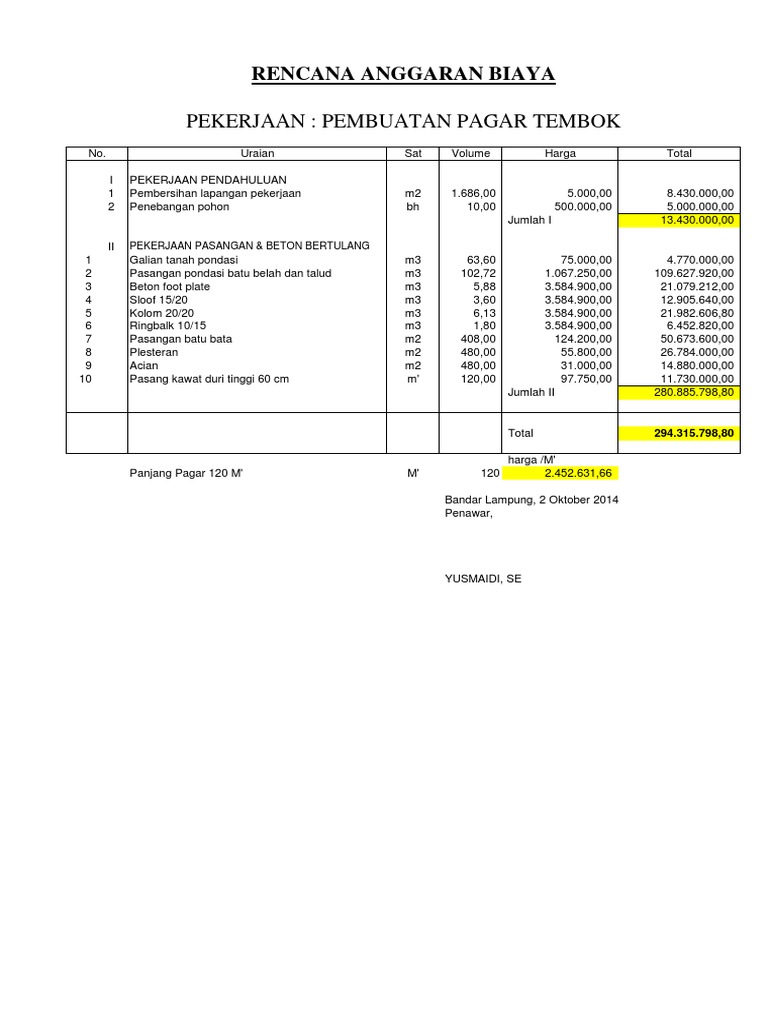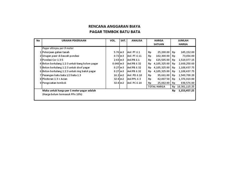 1 Satu Bundle Proposal. Contoh dari rab pagar tembok biasa polos tanpa variasi rencana pembangunan tembok panjang 6 m dan lebar 6 m tinggi 3 meter maka total panjangnya adalah 12 m dan luasnya adalah 36 m2 setiap 3 m dibutuhkan satu kolom praktis sehingga dibutuhkan 5 kolom maka prediksi biaya yang harus dikeluarkan adalah. Anda tinggal mencari daftar harga tiang pagar brc.
